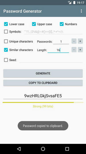 Step 4. Finally tap on "Generate" to create a tough password using this app and you can tap on "Copy to clipboard" to paste it on a text file or email if needed.