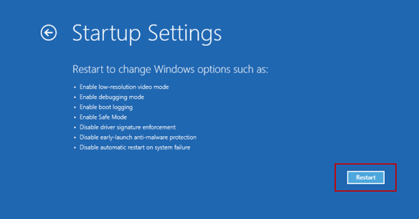 Now, you will see a sky blue color screen and you need to choose Troubleshoot. Choose the "advanced options". Select "Startup settings", which allows you to change Windows startup behavior.