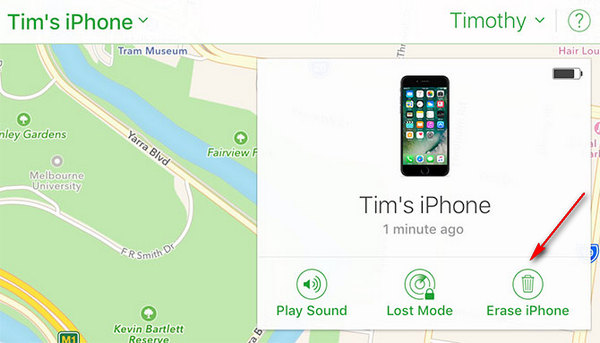 Step 3 : Choose your iPhone name and hit the "Erase iPhone" button.