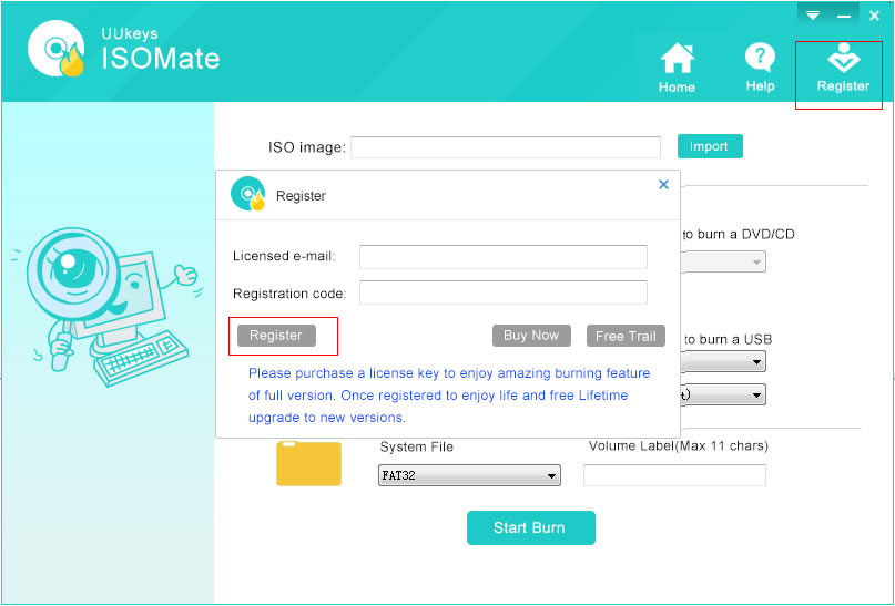 Simple click "Register" button on UUkeys ISO Mate and input the email and registration code to activate the program. Once it is done, the icon will be shown as "Registered".