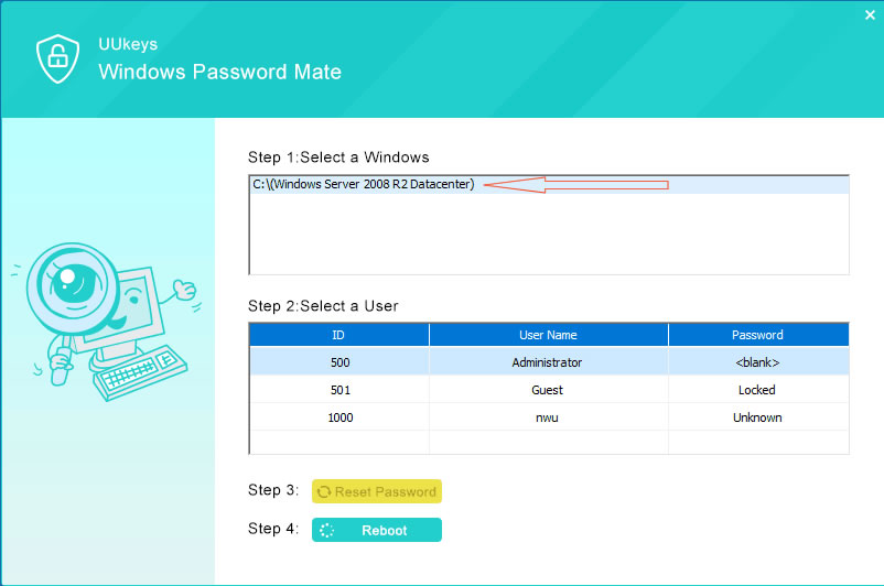 UUkeys Windows Password Mate Advanced works well with major Windows server versions, including Windows Server 2000, 2003, 2008, 2012, 2016. It also supports other Windows operating systems like Windows XP/Vista/7/8/10. Please follow the steps in below to instantly reset Windows server admin or user password.